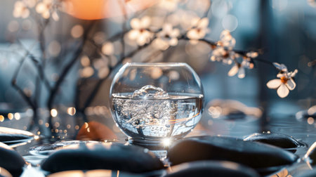 Elegant glass bowl filled with water and cherry blossoms, reflecting light and surrounded by smooth black stones, creating a tranquil and serene ambiance.
