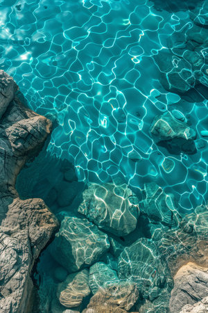 View from above of the crystal clear water along the shoreline with rocky seabed.