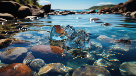 Vibrant crystal formations float gracefully in clear aqua water, showcasing intricate reflections of sunlight, evoking beauty and tranquility in nature.