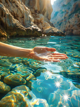 Hands gently touch the surface of clear water, creating ripples. The setting suggests a serene moment in nature, inviting feelings of calm and tranquility..