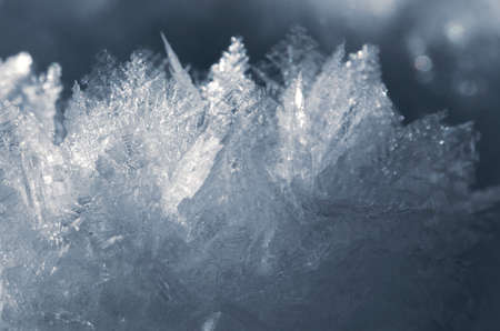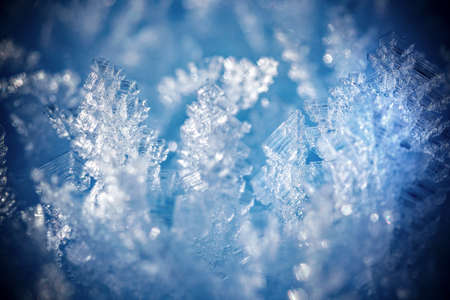 Macro closeup of ice crystals on blue background with shallow depth of field