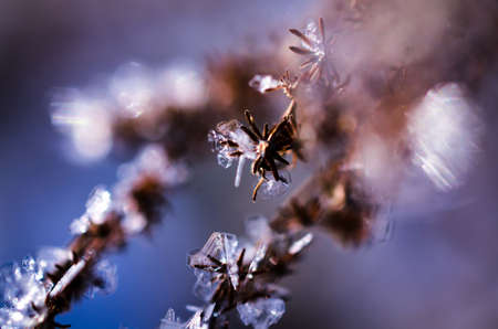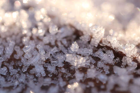 Close up of ice crystals showing their intricate structure on a frosty winter day with beautiful bokeh light shining through them