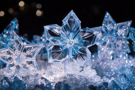 Intricate icy crystals shaped like stars and snowflakes form beautiful decorations, capturing the essence of a festive winter atmosphere.