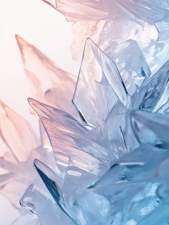 Macro shot showcases intricate frozen ice crystals against a soft gradient background, highlighting the beauty of winter and intricate natural designs.