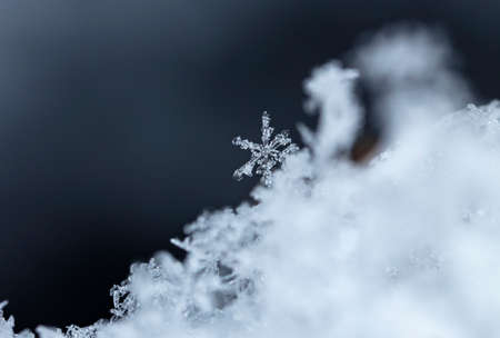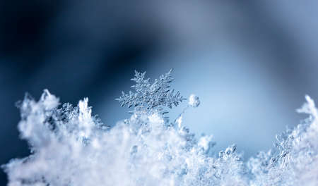 Natural snow crystals. Very frosty weather in the mountains. Macro photography