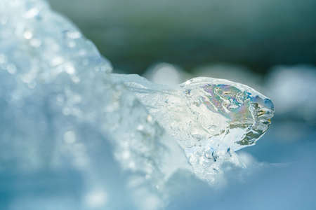 Transparent shining clear ice icicles close-up sparkling on frozen wild lake shore in sunset light. Cold winter nature background