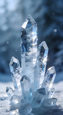 This stunning close-up showcases beautiful crystal formations glimmering under sunlight, creating a magical winter landscape filled with shimmering ice and frost.