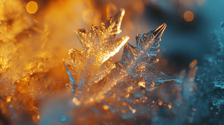 Captivating macro shot of ice crystals glimmering with a warm orange glow, showcasing intricate textures and unique shapes for a stunning visual impact.