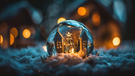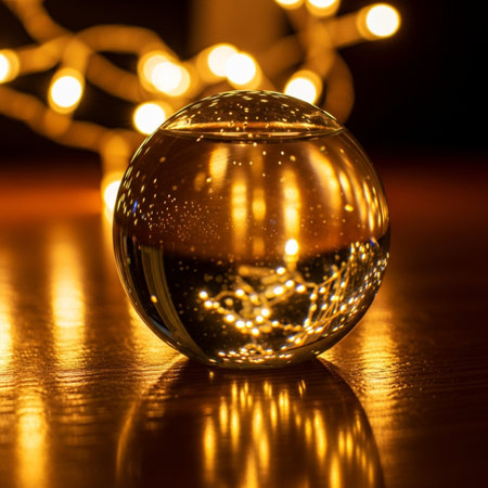 A magical close-up of a Christmas ornament reflecting warm bokeh lights in the background. The festive and cozy atmosphere is perfect for themes related to holidays, celebration, and winter decorations.