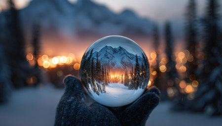 A hand wearing a glove holds a crystal ball, reflecting a winter landscape. The scene features snowy trees, mountains, and bokeh lights creating a soft, blurred background. This visual could be used for various commercial projects related to winter, travel, or conceptual themes. The image uses natural lighting.
