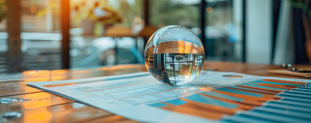 A creative shot of financial reports next to a crystal ball, emphasizing forecasting performance