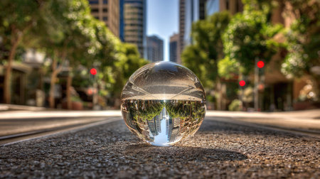 Crystal ball reflecting a blurred city street scene with bokeh lights at dusk. Inverted urban landscape within a glass sphere. Colorful streetlights and car trails creating a vibrant background. Magical perspective, unique view of a bustling cityscape. Evening ambience, abstract beauty of city life.