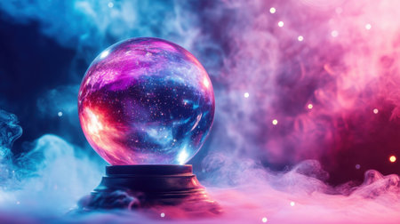 A mystical crystal ball emitting light, set against a backdrop of cosmic mist and soft sparkles.