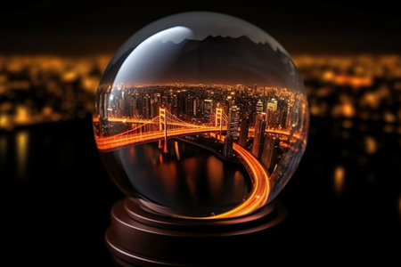 A large city is reflected in a glass ball. The city is lit up at night, creating a warm and inviting atmosphere. The ball is placed on a surface, drawing attention to its unique and captivating design