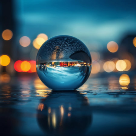 Reflection of City Lights in a Glass Sphere on Wet Pavement at Dusk with Bokeh Background Effect