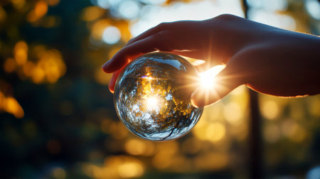 A hand holding a glass sphere that reflects vibrant forest leaves, symbolizing connection with nature and sustainability.