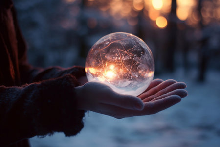 A hand cradles a crystal ball reflecting a snow-covered forest with soft, glowing lights in the background. The image has a shallow depth of field, with cool blues and whites dominating the scene. The composition suggests a serene, contemplative mood, suitable for various editorial and conceptual applications.