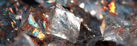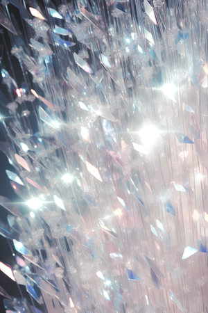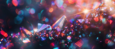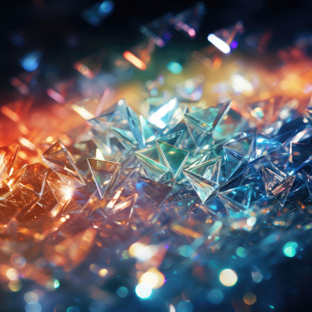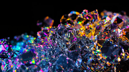 A close-up view of shiny, sparkling crystals exhibits an intricate texture. The crystals glimmer and reflect light, creating a stunning array of colors and reflections. Their surface captures and disperses light, giving a sense of depth and brilliance in an enchanting atmosphere filled with shimmering details.