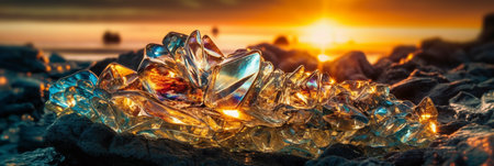 Sunset on the beach with a group of crystal stones. Beautiful natural background.
