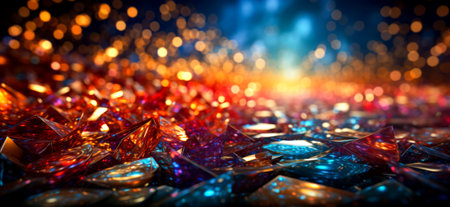 Bright showing macro shot of sparkling colorful glitter and confetti fragments exploding and shimmering against a dark background with bright starburst effects...