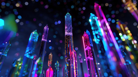 This striking image features a collection of vibrant colorful crystals illuminated against a dark backdrop, creating a magical atmosphere with sparkling bokeh effects.