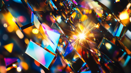 Abstract prism shapes reflect a radiant color spectrum from blue to yellow, creating a dynamic, colorful backdrop with bright light shards across a deep black background.