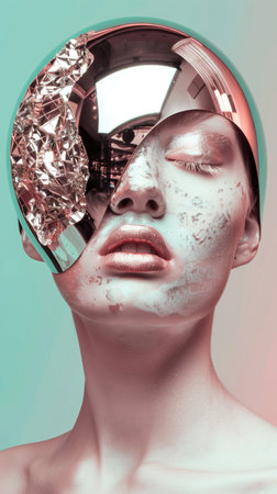 An AI generated illustration of a woman's face covered with plastic