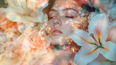 A womans face up close, adorned with delicate flowers, creating an ethereal and enchanting look.