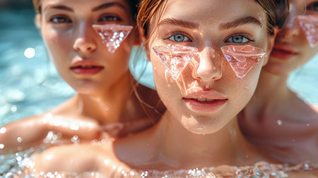 Close-up portrait of a beautiful woman with ice cubes on her face