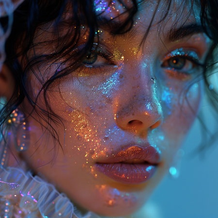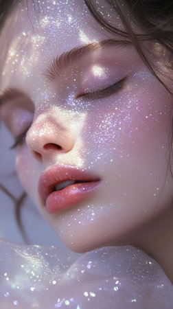 A captivating close-up portrait showcasing a young woman adorned with shimmering glitter and a sparkling background, evoking beauty and creativity.
