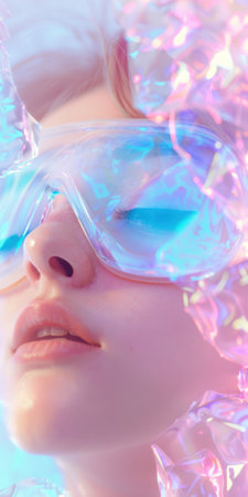 Futuristic human face adorned with translucent crystals, reflecting pink and purple hues. The artwork emphasizes surrealism, blending enchanting light effects with a captivating gaze