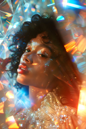 A woman with captivating features surrounded by vibrant sparkling fragments in a darkened studio setting.