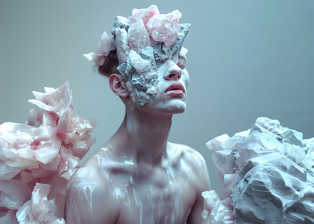 Fashion surreal Concept. A man sculpture with crystal limestone agate mineral rocks on muted pastel background. dynamic composition dramatic lighting. copy text space