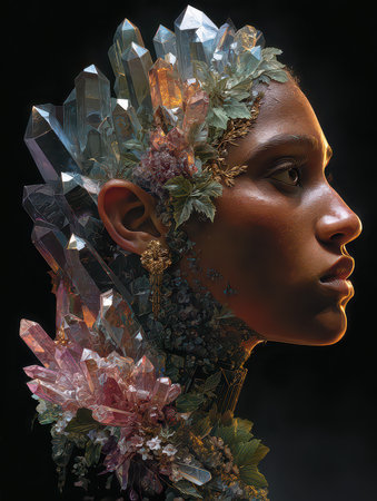 Captivating portrait of a woman adorned with vibrant crystals and flowers, blending nature and art to create a surreal and elegant visual experience.