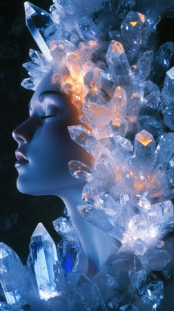 Profile of a woman with crystal-like structures enveloping her head and neck, reflecting iridescent colors. Soft lighting emphasizes the ethereal and futuristic appearance