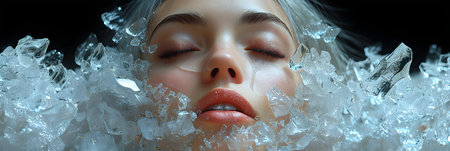 A young woman rests in shallow water, her face framed by sharp ice shards that create an intriguing contrast against the calm backdrop. Her pale skin and closed eyes convey a sense of stillness and introspection.