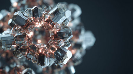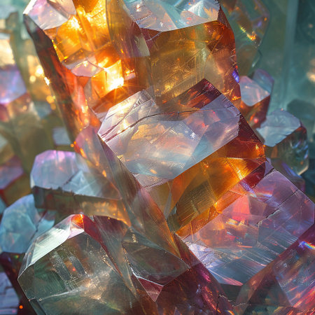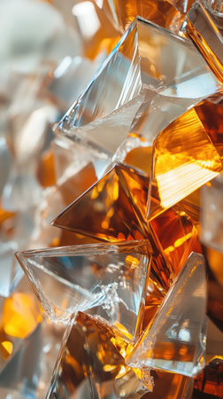 Shimmering crystals in warm tones create a vibrant and dynamic visual experience, highlighting reflections and textures in an abstract background