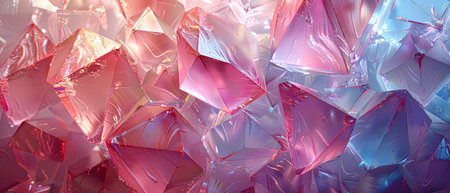 A digital illustration of an abstract geometric design featuring a kaleidoscopic pattern of teal and pink iridescent crystals.