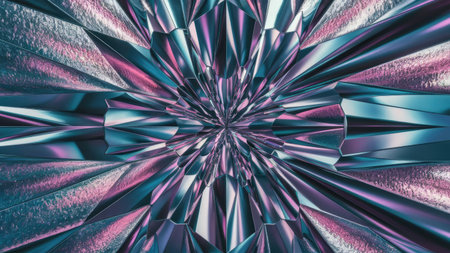 A digital illustration of an abstract geometric design featuring a kaleidoscopic pattern of teal and pink iridescent crystals.