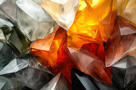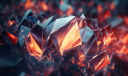 Shimmering crystals in warm tones create a vibrant and dynamic visual experience, highlighting reflections and textures in an abstract background