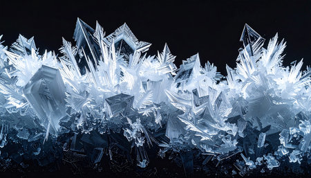 Sharp, geometric ice crystals create a detailed frosty edge with intricate patterns against a dark backdrop.