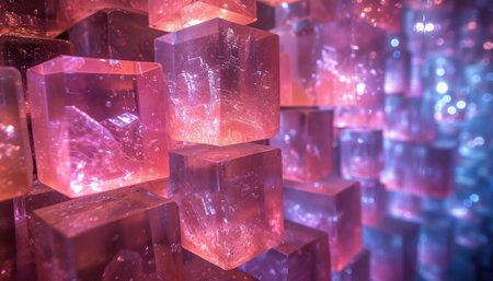 A multitude of luminous geometric blocks in a mystical arrangement, bathed in pink and blue hues.