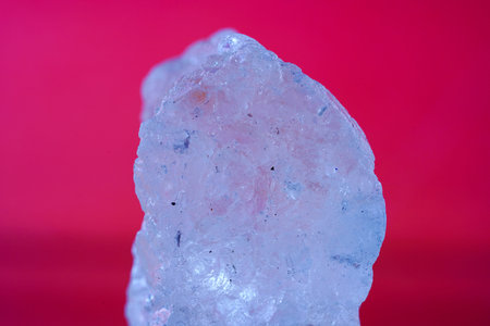 Close-up of a crystal of quartz on a red background.