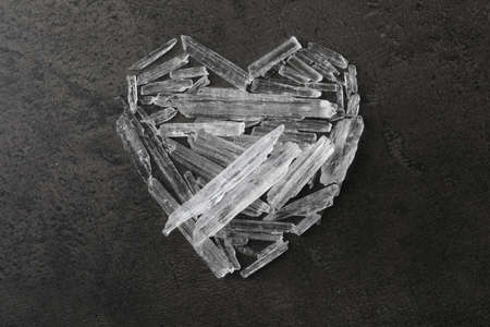 Menthol crystals in shape of heart on gray background, flat lay