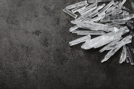 Menthol crystals on black background, closeup. Space for text