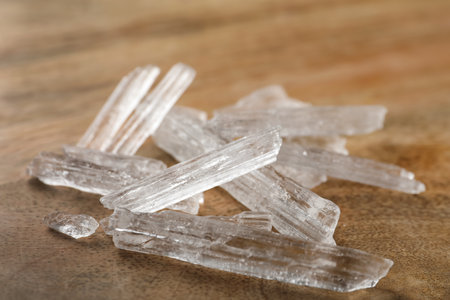 Menthol crystals on wooden background, closeup view