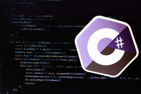 Moscow, Russia - 1 June 2020: C sharp logo sign with program code on background Illustrative Editorial.