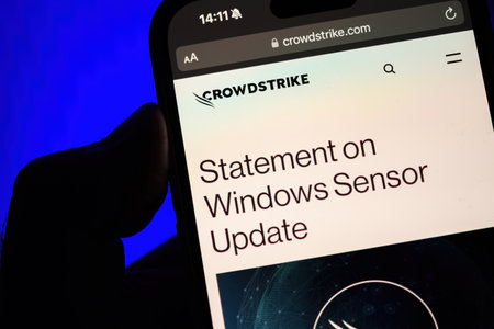 Paris, France - Jul 20, 2024: A male hand holds an iPhone displaying a CrowdStrike webpage with a Statement on Windows Sensor Update, set against a bright blue background, highlighting the companys communication about a critical update
