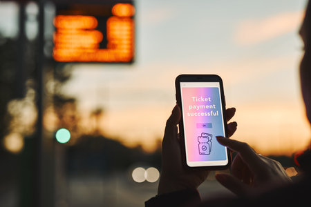 Woman buying ticket online near bus stop before ride. Person paying for ticket using mobile payment app. Buying service on the go. Order confirmation on mobile screen. Top up account. Bus routes schedule in background