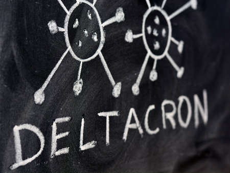 Variant of the covid 19 virus, deltacron, drawn on a blackboard with chalk